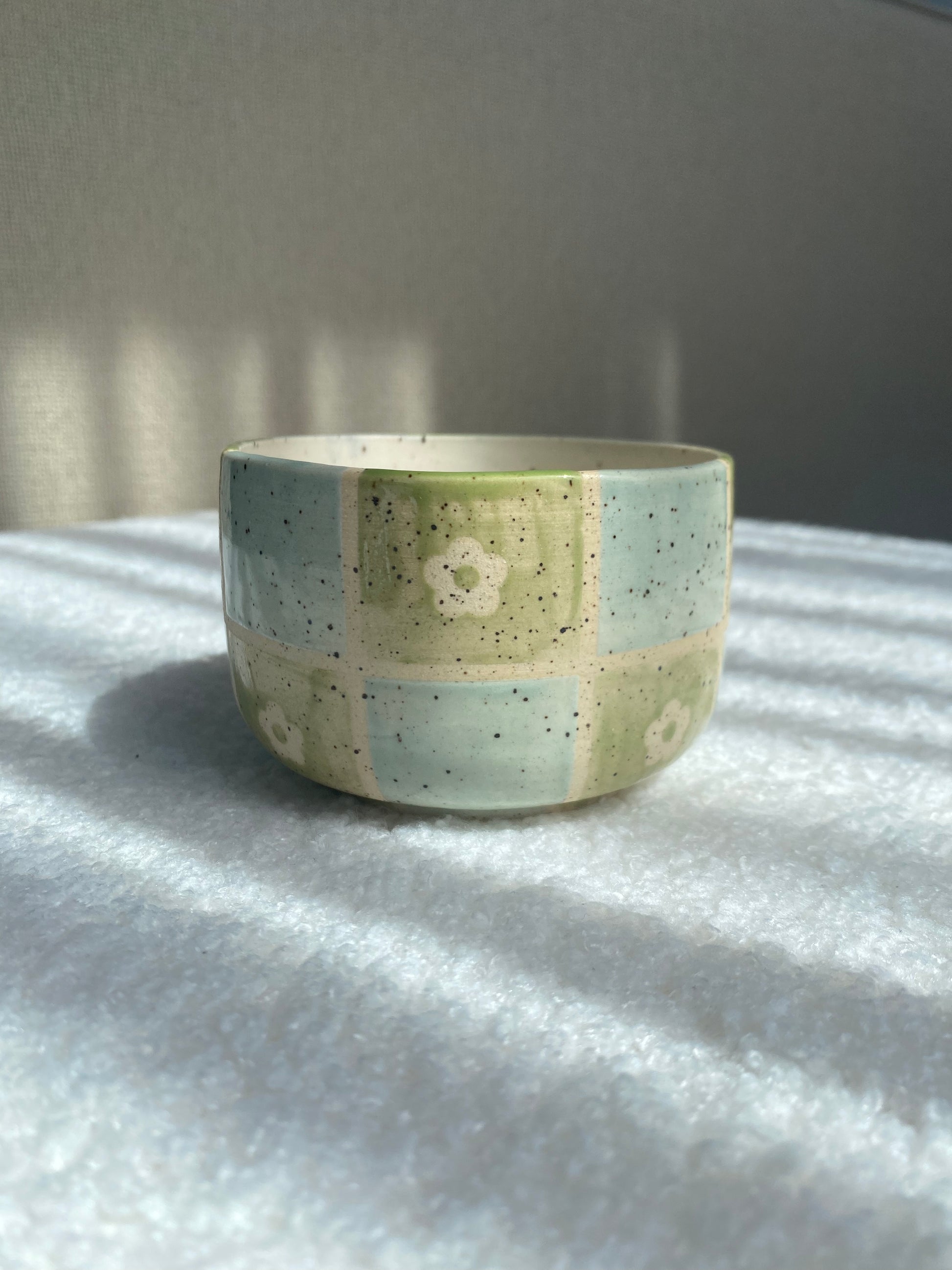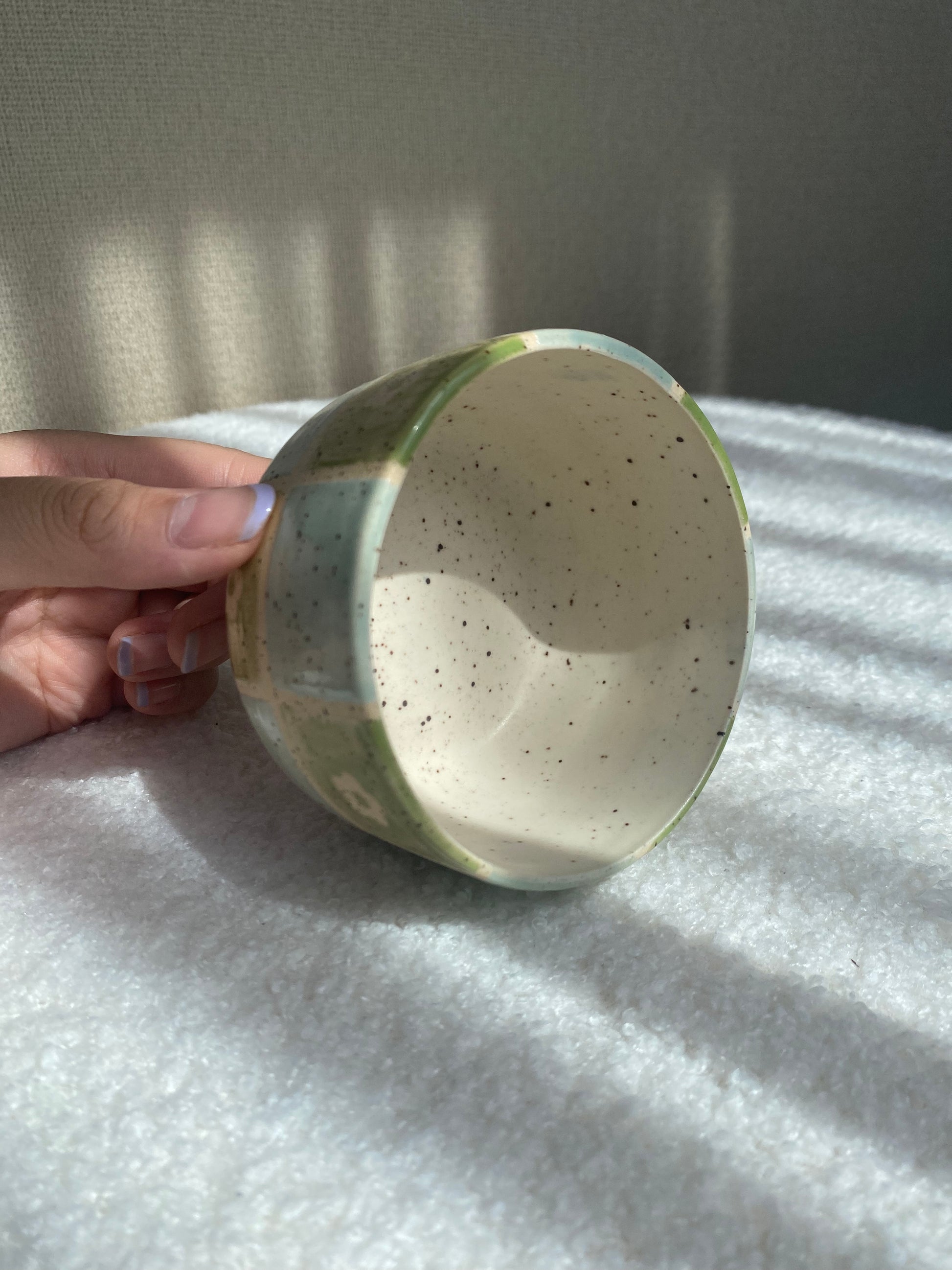 Handmade speckled ceramic with blue and green grid pattern. Can be used as a planter or small cup.