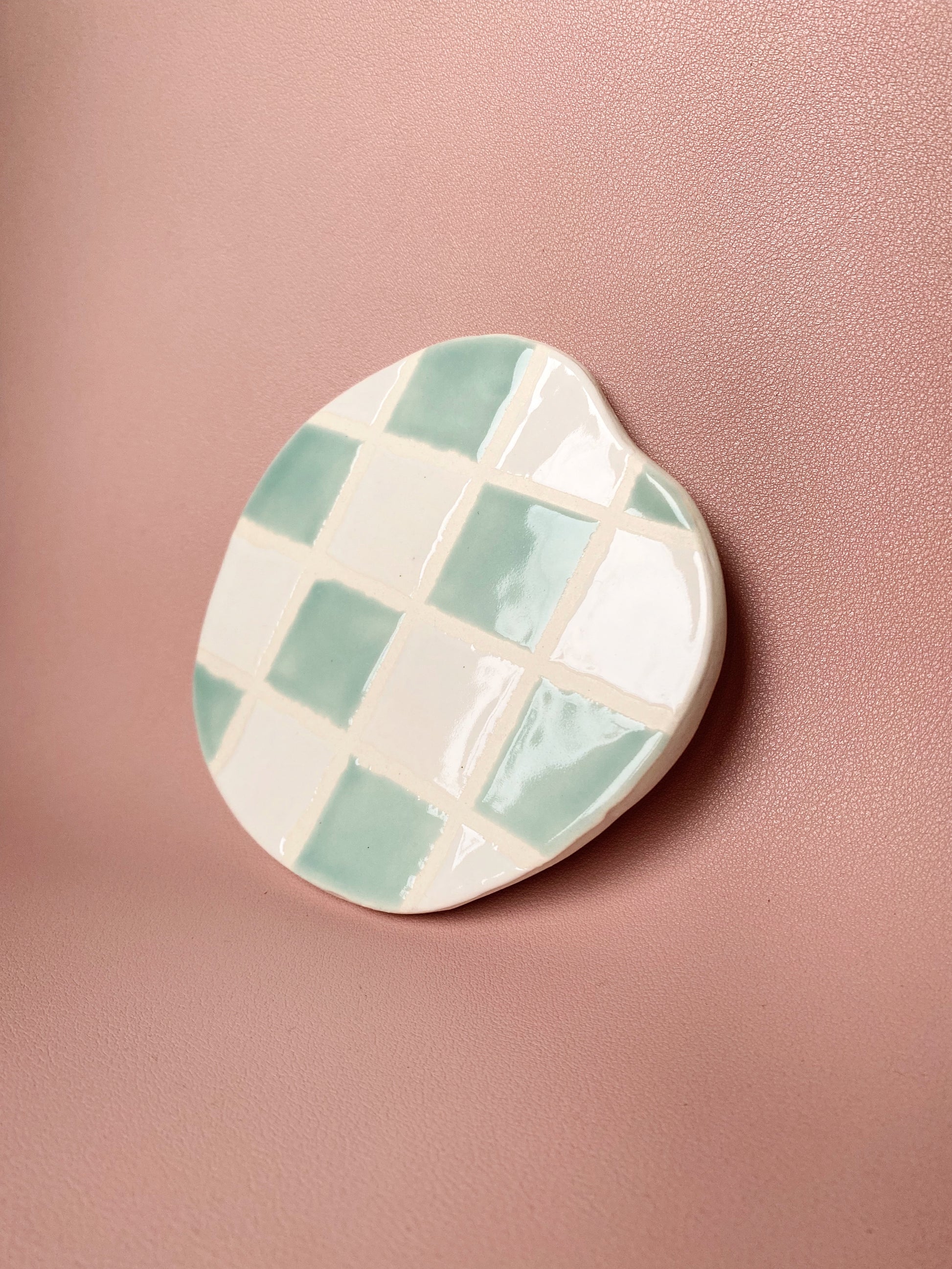 Handmade ceramic coaster with handpainted blue and white checkered glossy glazes. Protect your desk from water damage with this adorable coaster.