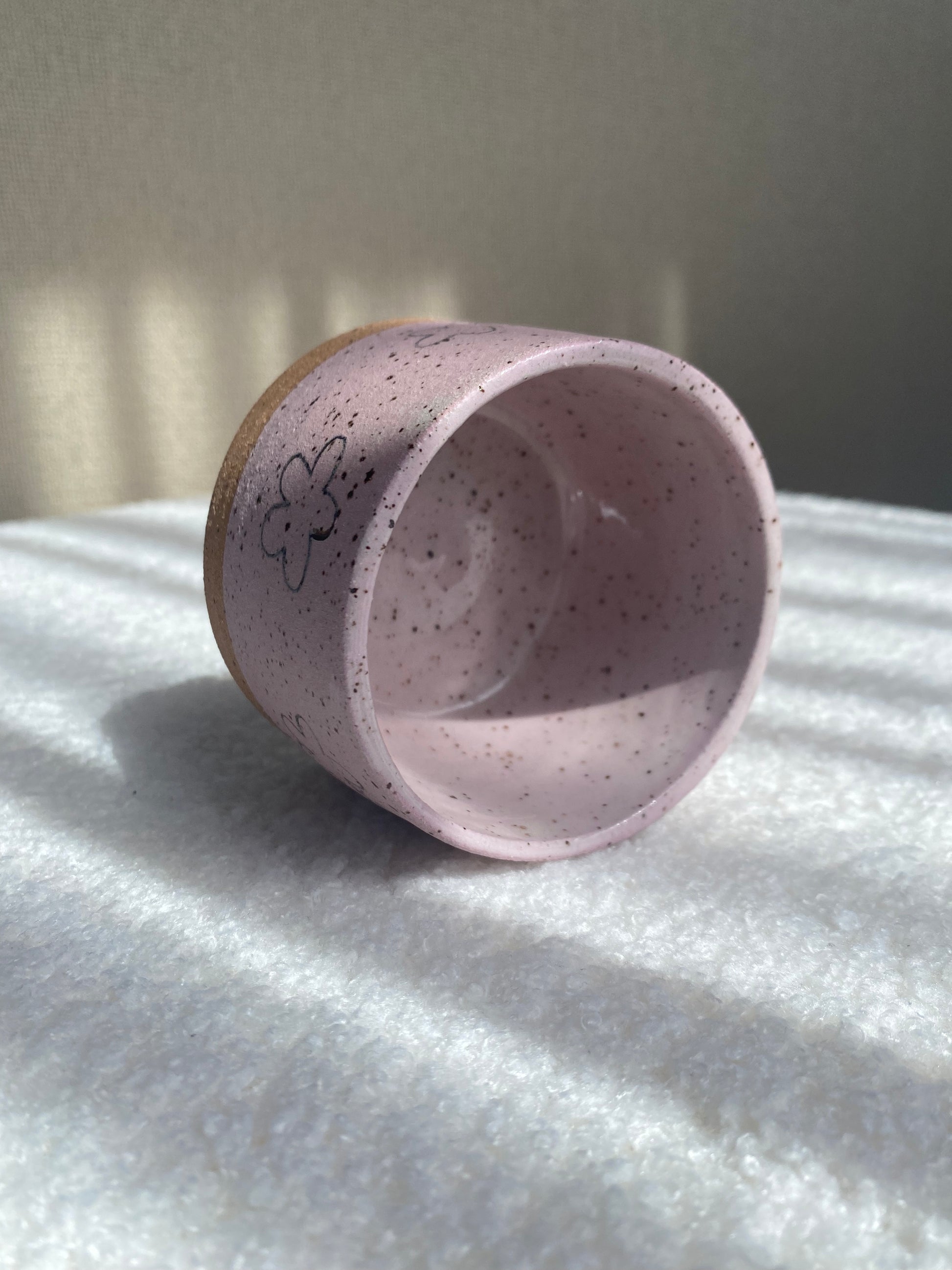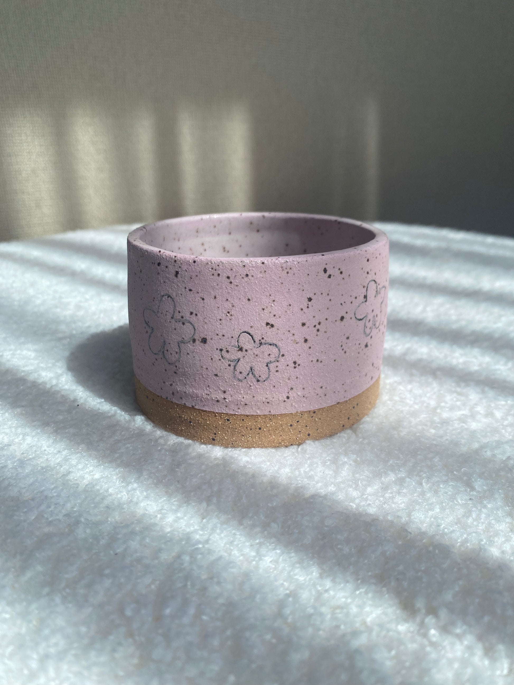Handmade speckled ceramic with pink underglaze and black underglaze flower doodles.. Can be used as a planter or small cup.