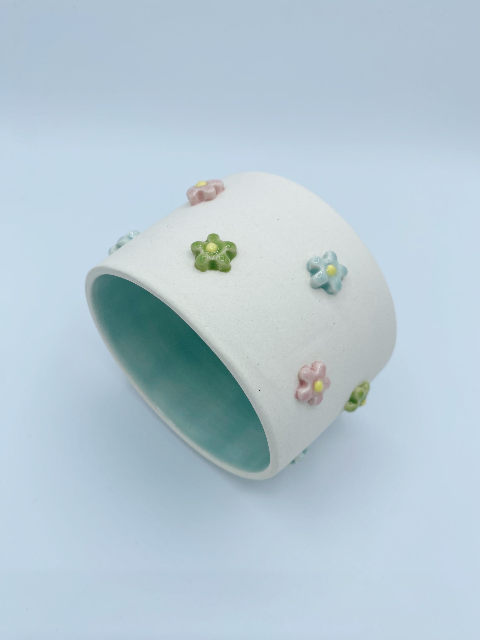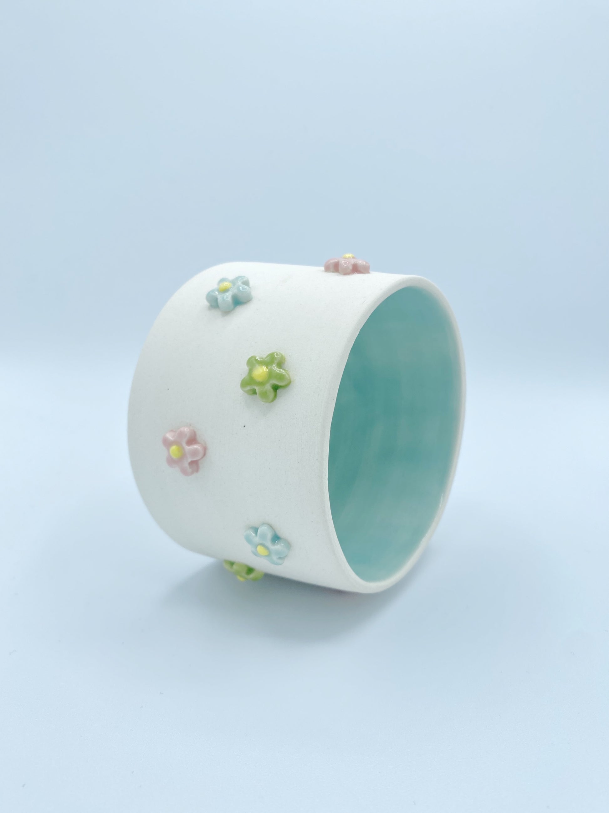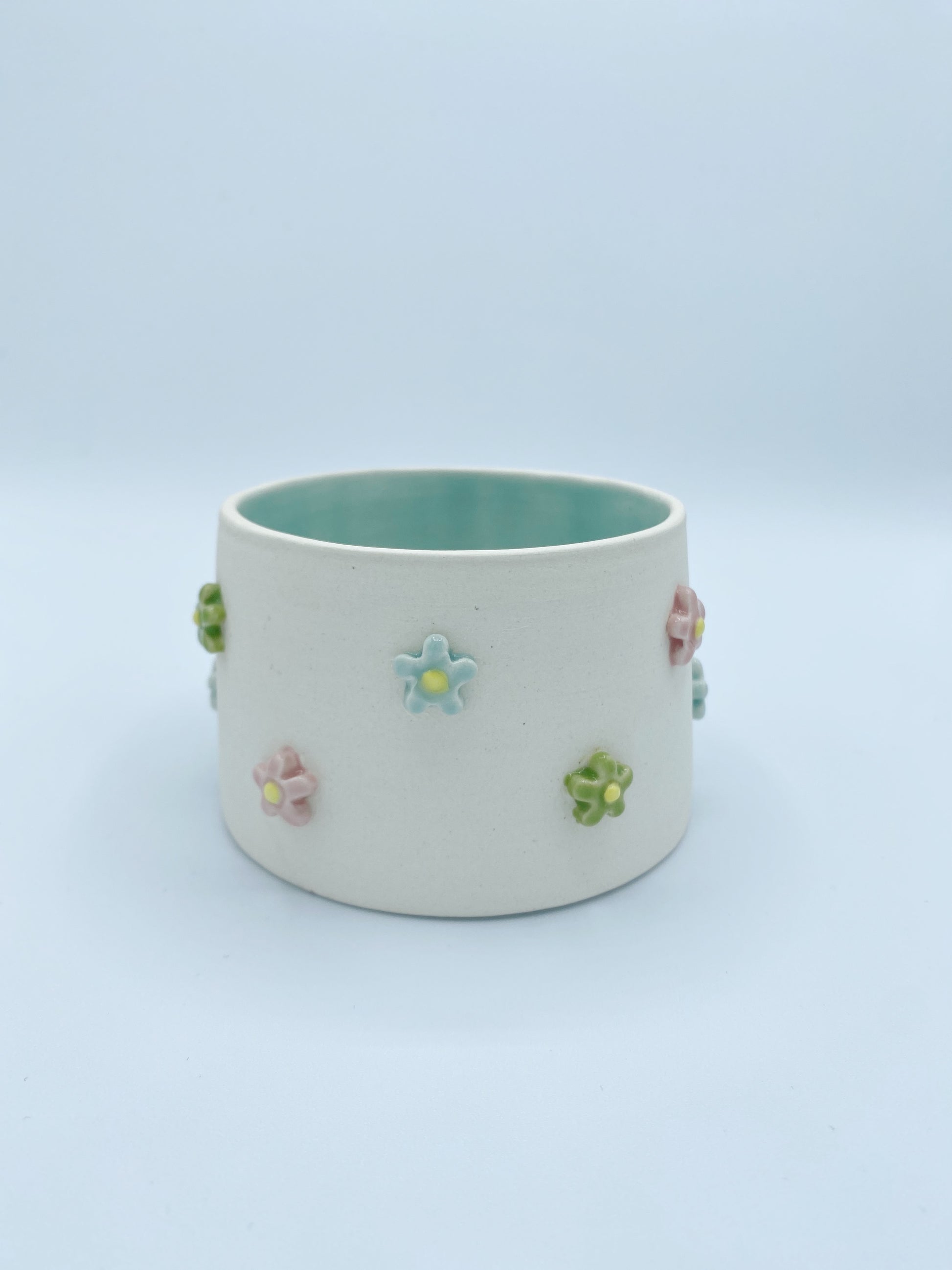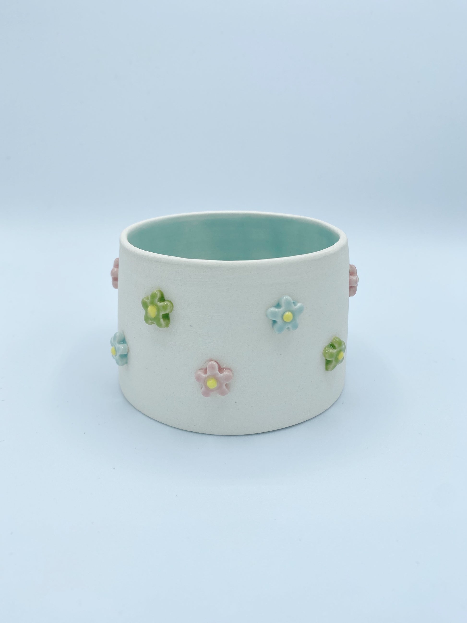 Handmade planter with small coloured flowers on the exterior and your choice of colour for the interior and option to add a drainage hole!